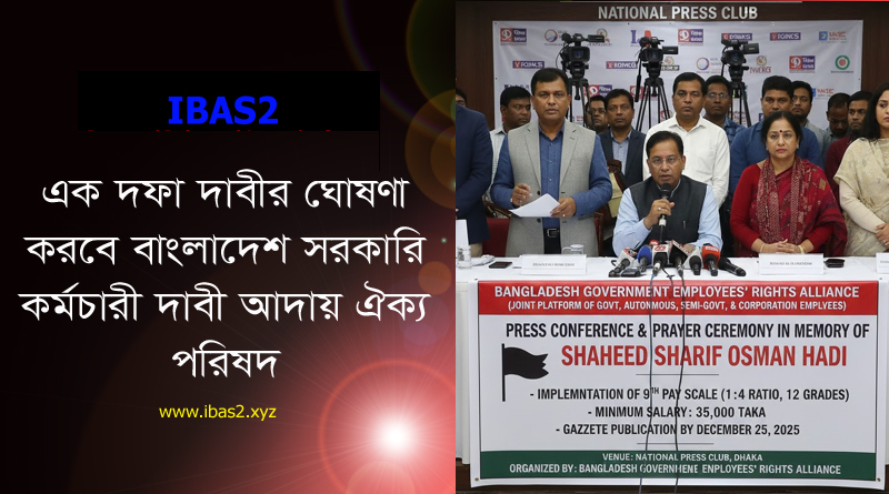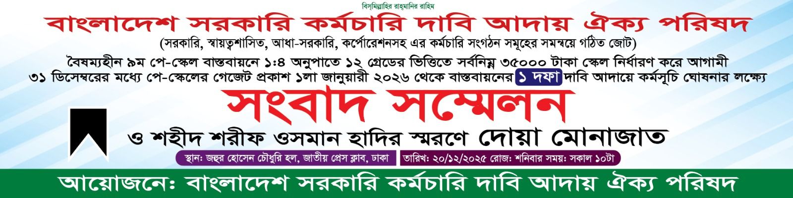 জাতীয় প্রেস ক্লাবে আজ শনিবার বাংলাদেশ সরকারি কর্মচারী দাবি আদায় ঐক্য পরিষদের উদ্যোগে এক সংবাদ সম্মেলন অনুষ্ঠিত হয়েছে। উক্ত সম্মেলনে ১১-২০ গ্রেডের সরকারি কর্মচারীদের দীর্ঘদিনের বঞ্চনা ও বৈষম্য দূরীকরণে ৯ম পে-স্কেল বাস্তবায়নসহ বিভিন্ন যৌক্তিক দাবি তুলে ধরা হয়। একইসঙ্গে জুলাই গণঅভ্যুত্থানে শহীদ ইনকিলাব মঞ্চের মুখপাত্র শরীফ ওসমান হাদীর রুহের মাগফিরাত কামনায় বিশেষ দোয়া ও মোনাজাত অনুষ্ঠিত হয়।