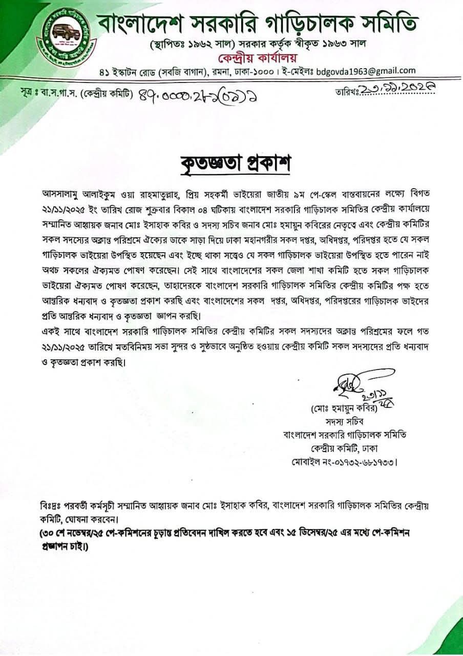 এছাড়া, বৈঠকে ৩০ নভেম্বর ২০২৫ তারিখের মধ্যে পে–কমিশনের চূড়ান্ত প্রস্তাব জমা দেওয়ার বিষয়েও গুরুত্বপূর্ণ দিকনির্দেশনা প্রদান করা হয় এবং ১৫ ডিসেম্বর ২০২৫ এর মধ্যে পে–কমিশন গৃহীত হবে বলে আশা প্রকাশ করা হয়। বিবৃতিটি স্বাক্ষর করেন মোঃ হুমায়ূন কবির, সদস্য সচিব, বাংলাদেশ সরকারি গাড়িচালক সমিতি, কেন্দ্রীয় কমিটি।